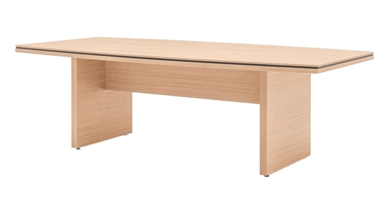 Konferenču galds uz stabilām slīpām metāla taisnstūra veida kājām ar manuāli regulējamām peciņām.